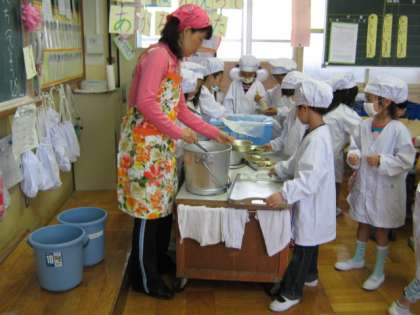 1年生の給食当番も少し慣れてきて,汁物以外の給食は自分たちで配れるようになりましたよ。