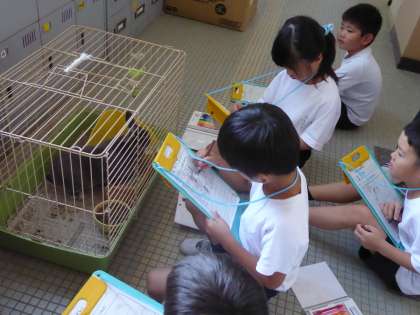 生活科の学習で,学校で飼っているうさぎのふわわちゃんの観察をしました。
