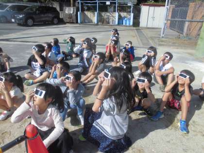 初めて遮光板を使った子どもたちは,「おお!!太陽がオレンジ色にみえるよ!」「すごくくっきり見える!!」と驚きの声をあげていました。