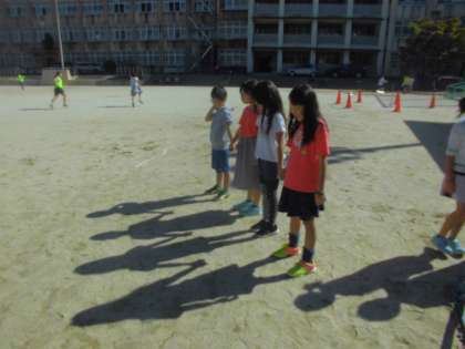 子どもたちは,休み時間に「やってみたい!」と運動場でかげおくりをして遊んでいました。「すっごーい!」「本当に見えたよ!!」「ばんざいしてるのもちゃんとわかったよ!!」と感動していました。とてもほっこりした,楽しい休み時間でした。