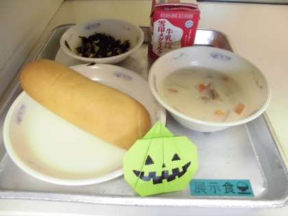 じゃがいものクリームシチューの中には,いろいろな形に型抜きしたにんじんを入れました。10月の行事にちなんで,コウモリとかぼちゃ,そしてハート,星の4種類です。