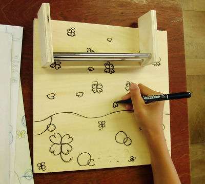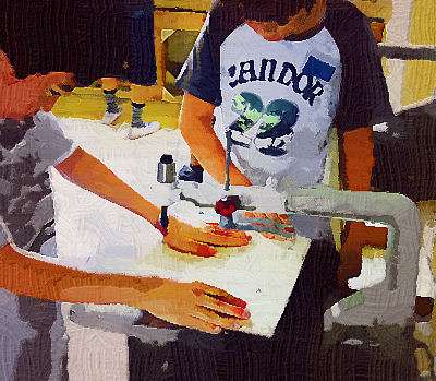 オリジナルデザインを考え,木に写し取り,そして,電動ノコギリで裁断し,彩色し,組み立てていきます。