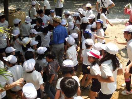 最後は全員で息を合わせてジャンプし,池の縁に粘土を固めて学作業を終えました。