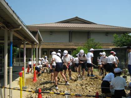 4年生のときに学習した「ビオトープ」づくりの完成に向けて,汗をたくさんかきながら,土をバケツなどに入れる班,土を運ぶ班・土をならす班に分かれて活動しました!!!