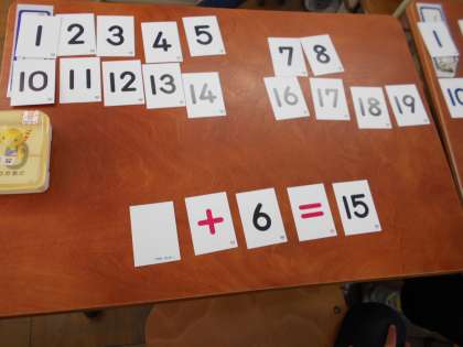 今日の算数は「かずあてゲーム」をしました。カードをたし算の式となるように並べ,裏返した1枚の数を考えます。