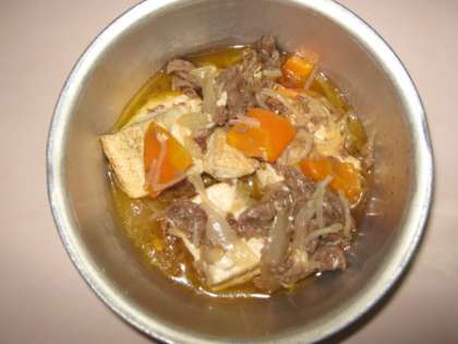『肉どうふ』には,牛肉・焼豆腐・たまねぎ・にんじん・糸こんにゃくが入っています。すき焼きの材料に,よく似ていますね。