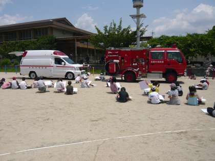 ひなん訓練にあわせて,消防車・救急車の写生会を行いました。