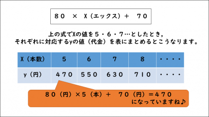 今日は80円のえん筆を数本と,70円の消しゴムを1個買ったときに代金がどのように変わっていくのかを文字と式で表す方法について紹介します♪