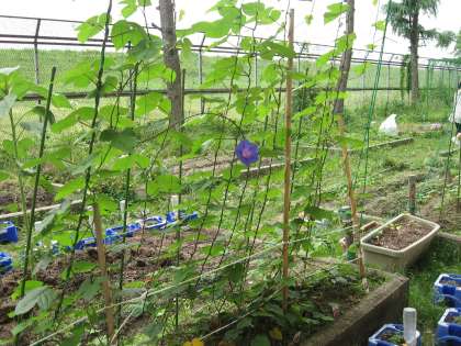 緑のカーテンとして,園芸委員会の子ども達と共に育てているオーシャンブルーの花が一輪咲きました。茎も大きく育ち教室をオーシャンブルーの葉っぱで早く覆ってくれるとうれしいです。