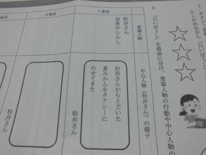 第1場面は,16〜17ページさいしゅう行までですね。登場人物が,「松井さん」と「お客さんのしんし」であることや,松井さんが「お母さんからとどいた夏みかんをタクシーにのせてきた」ことをたしかめましょう!いちばん大きい夏みかんを車にのせてきたことからも,お母さんの思いを感じる松井さんのやさしさが分かりますね!