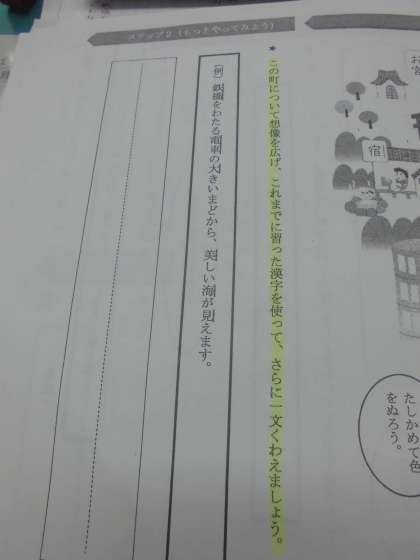 「漢字の広場」のかだいのさい後に,「この町について想像を広げ,さらに一文くわえましょう。」という問題があります。「どう書いたらいいのかわからない」「むずかしい」という声を聞いたので,アドバイスを送ります!