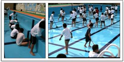 ひとりひとつのタワシをもって,プールの底面,壁面をピカピカに磨きました。