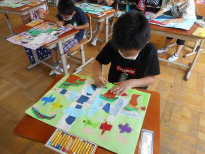 やぶいた形から様々な発想が広がり,とても楽しい作品が完成しました!