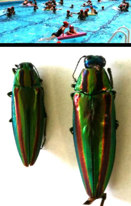 そして,今日,クラス対抗水泳大会をしたり,ほんの数分だけ自由時間を設定しました。そんな時,ふと,見ると,タマムシが2匹いました。