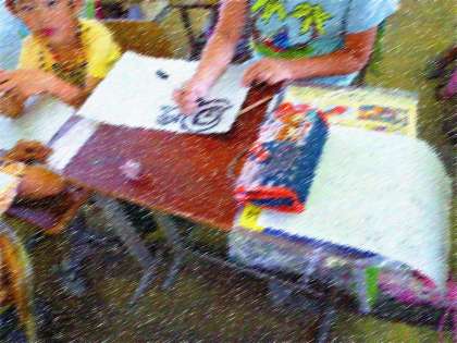 作品に文字を入れたいと言う子もいて,鏡文字に挑戦しています。