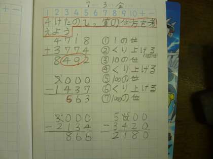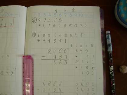 となりの位がゼロだから,そのとなりからかりてくる方法を学びました。