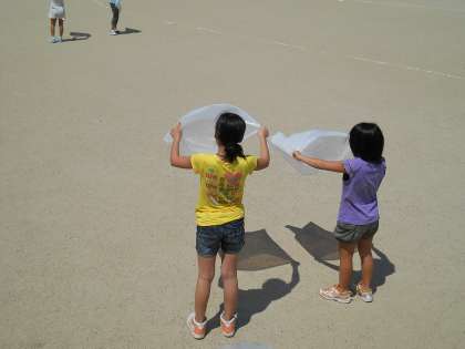 今日はその空気を大きな袋に閉じ込め,ボールのように打ち合ったり,座ってふわふわした感じを楽しんだりして,空気の存在を体感しました。