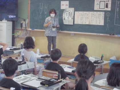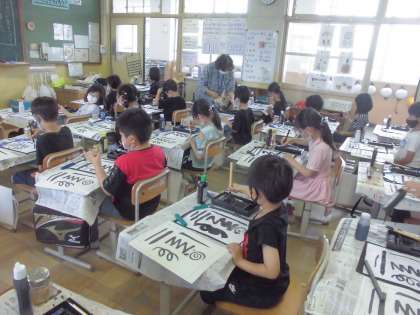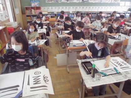 書写の学習では,毛筆学習がスタートしました。はじめは,いろいろな線を書く練習です。子どもたちは,少し緊張しながら書いていました。