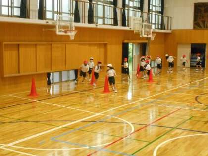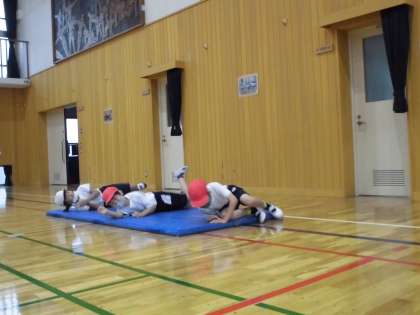 体育科の学習で「まねっこあそび」をしました。リーダーの友達の動きを真似しながら,マットの上を進んだり,コーンをくねくね進んだりしました。動きも十人十色で,ウサギのようにピョンピョン跳んだり,わかめのようにくねくね動いたり,腕の力だけアザラシのように動いたりしていました。また,明るい音楽の時は,跳ねるように動いたり,ゆったりした音楽の時は,翼を広げるように動いたり,音楽に合わせて動きを工夫することもできました。
