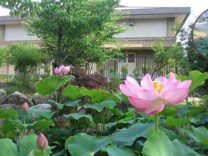 おはようございます。美豆小学校夏の風物詩となった「まる池」(鏡池)の蓮が見事な花を咲かせています。これから次々と咲き続け,来校者を出迎えます。
