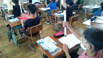理科では,とじこめた空気や水について学習しています。この器具を使って,とじこめた空気や水って,どのような様子になるか調べたりしました。
