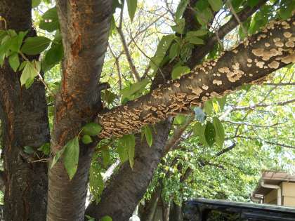枝をよく見てみると,マイタケに似たきのこが生えていました。この前の台風の時の湿気からでしょうか?