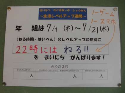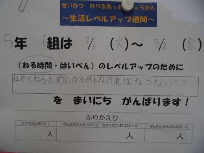 夏休みに向けて,各クラスで「生活レベルアップ週間」に取り組んでいます。「生活レベルアップ週間」とは,5月に行った生活チェック週間で課題のあった「排便」「就寝時間」のレベルアップを目指して,クラスで一つのことを実践する取組です。今日は5年生の取組を紹介します。