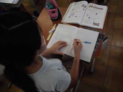 表を使って考える学習の2時間目です。この日の学習では,壁に沿って1mの仕切り板を11枚並べて花だんを作るとき,面積がどのように変わっていくかを調べます。