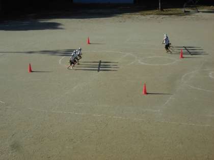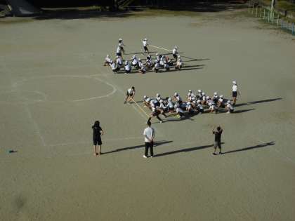 この日の体育では,クラス合同で台風の目の練習を行いました。今回の練習をふまえ,走る順番や走る時のポイントを考え,次の対戦に生かします。