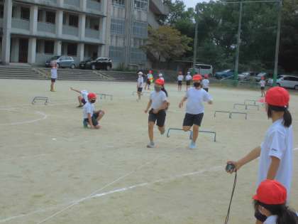 体育の学習で「小型ハードル走」に取り組んでいます。