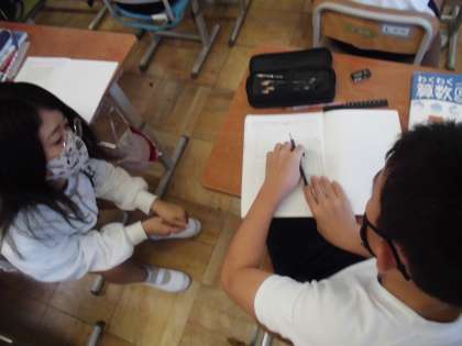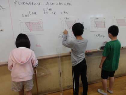 5年生の算数科の学習で,「面積」の学習が進んでいます。これまでに学習した長方形,正方形,三角形の面積の求め方をもとに,平行四辺形の面積の求め方を考えていきます。補助線を引いたり一部分を動かして形を変えたりと様々な考えを図にかいていきます。すると,三角形が2つ分になるということや,長方形に変えて考えることが分かってきました。そうして,平行四辺形の面積を求めることができました。自分の考えを友達に伝えることも頑張っていきます。