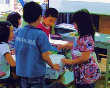 次に,みんなの前で自分の考えを発表するために,ノートをスキャナー付きのプロジェクターでスキャニングします。子どもたちはとても手慣れた様子でとてもうまくスキャニングしていました。