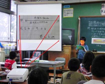 クラスの子どもたちは,大写しにされたノートに興味を持ちながら注視し,しっかりと発表を聞いていました。