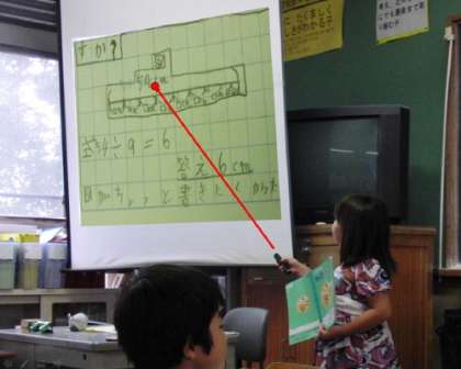 そして最後に,プロジェクターで大写しにされた自分のノートを見せながら,自分の考えを発表します。レーザーポインターを使って発表する子もいました。
