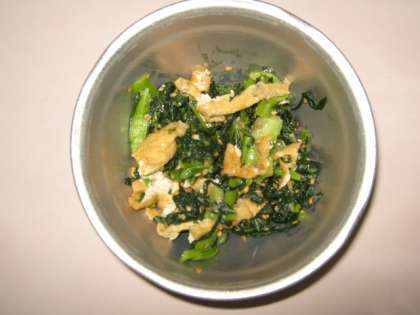 副菜の「青菜の中華風いためもの」は,にんにく味のきいた炒め物です。油揚げと小松菜を炒めました。小松菜の歯ごたえを楽しいんで,食べてくれていました。