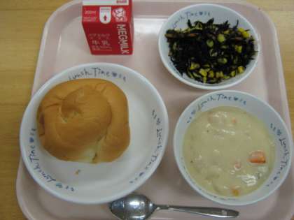 今日の献立は,『バターうずまきパン・牛乳・きのこのクリームシチュー・ひじきのソティ』でした。