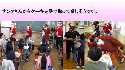 あれれ?サンタさんがいっぱい。トナカイもいっぱい。ケーキを受け取った子どもたちは黙食ながら,ニコニコ笑顔があふれていました。