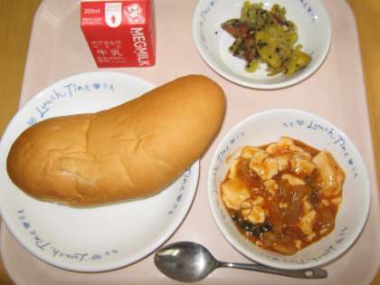 主菜は,「えびと豆腐のケチャップ煮」でした。トウバンジャンが入り,