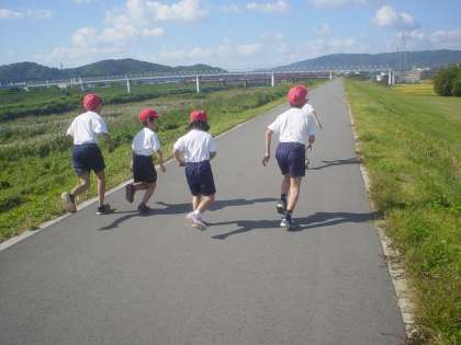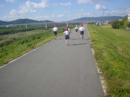 伏見西支部の育成学級合同運動会に向けた練習で,堤防をマラソンしました。