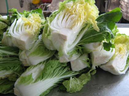 今日は『白菜とほうれん草のごま煮』です。大きな白菜が納品されました。22kgの白菜を,洗って手早く切っていきます。