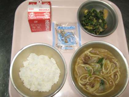 今日の給食は,『ごはん・牛乳・カレーうどん・ほうれん草と白菜のごま煮・じゃこ』でした。