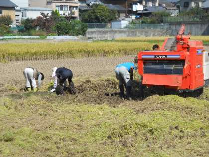 5年生の児童が田んぼを去った後,地域の方が作業の続きをして下さっています。稲刈りという貴重な体験学習を提供してくださり,ありがとうございました。