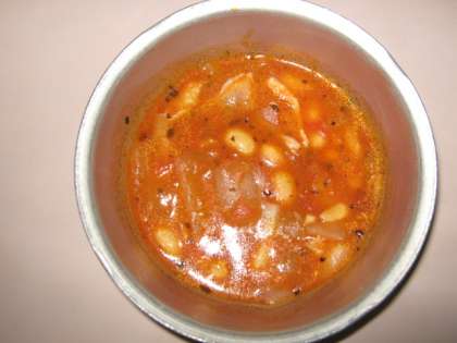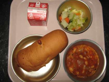 副食は『大豆と鶏肉のトマト煮・野菜のホットマリネ』です。「トマト煮」には,にんにくやしょうが,バジルといった香味野菜や香辛料が使われています。苦手な大豆もトマト味ということで,ほとんど残さず食べていました。