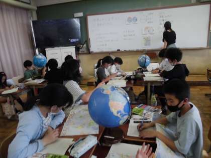 社会科で,地球儀の見方を学習しました。地球儀を見ながら経線や緯線についてや日本が北半球にあることなどを確かめました。地球儀を見ていると,世界の中で日本がどのような位置にあるのか,日本の国土の広さなど気づいたことをたくさん交流していました。
