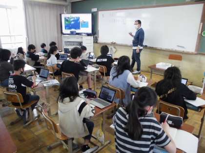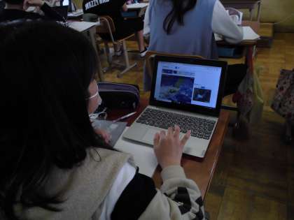 理科で,タブレットを使って天気についての学習をしました。天気の観察を通して,天気が西から東に変わっていくことを学んだ子ども達は,気象衛星からの情報をもとに,今後の天気を予想しました。午前中の授業で見た情報で,だんだんと雲が近づいている様子が分かり,昼過ぎに雨が降るんじゃないかという予想が当たって喜んでいる子どももいました。