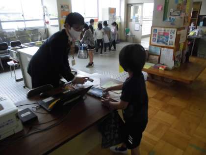 たくさんの本に目を輝かせながら,今年度初めて本の貸し出しを行いました。