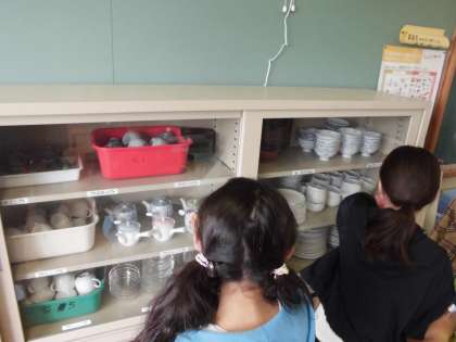 5年生の家庭科の学習で,家庭科室を探検しました。使う道具の名前を見て,どうやって使うのか,何ができる道具なのかを調べていました。「これ使ったことある!」「この鍋でお米炊けるの?」など,見つけたものからたくさんの感想を出していました。
