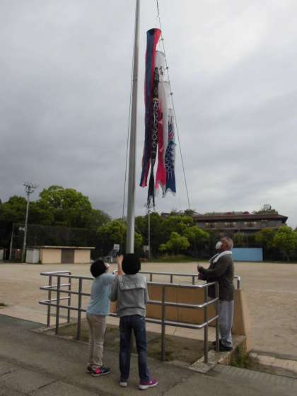 管理用務員さんと一緒に運動場の朝礼台の近くのポールに,鯉のぼりをつけました。ゆっくりゆっくり鯉のぼりをあげて,上まであがるととても嬉しそうな子どもたちでした。