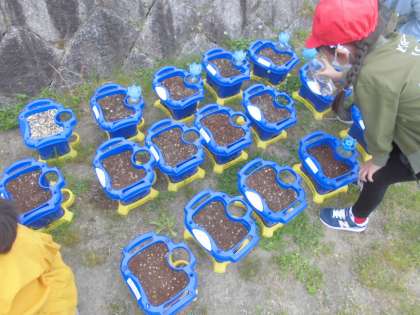 今週月曜日の生活の授業で,学年でトマトの種を植えました。昨年使用していたチューリップの鉢植えに,新しい土を混ぜて小さな畑を作ります。子供たちはシャベルを使って上手に混ぜていました。そこに手で筋を2本つけて,トマトの種をまきました。少し前の生活の授業で観察した時には「ゴマみたい」,「種の周りに毛が生えてる」,「こんな小さな種からどうやってあんなに大きなトマトができるんだろう」など興味津々だった種です。そのあとは「大きく育ってね」,「おいしいトマトになってね」と願いを込めながら水を上げました。少しずつ成長して,赤くて丸くてかわいいトマトができるといいなと思います。