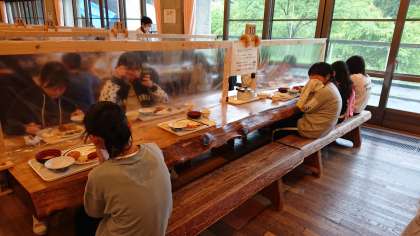 お風呂にゆっくり入って、みんなほっこりしています。夕方5時から晩ごはんを食べて、クラスごとにキャンプファイヤーの練習をしています。みんなで盛り上げることが何より大事です。大いに楽しみます。